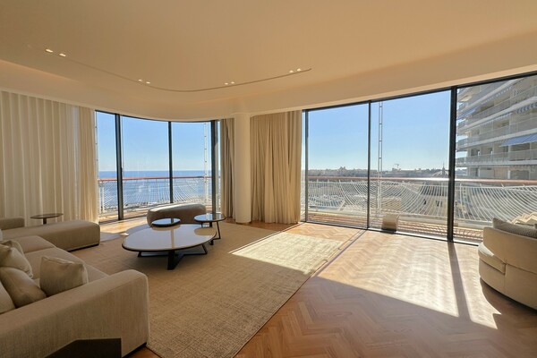 Eine atemberaubende Maisonette-Wohnung mit 4 Schlafzimmern zur Miete in der Residenz One Monte Carlo, die auf der 9. und 10. Etage eingerichtet ist und einen Panoramablick auf das Meer und die Stadt bietet. Das One Monte Carlo ist eine moderne Residenz im Herzen des Place du Casino.